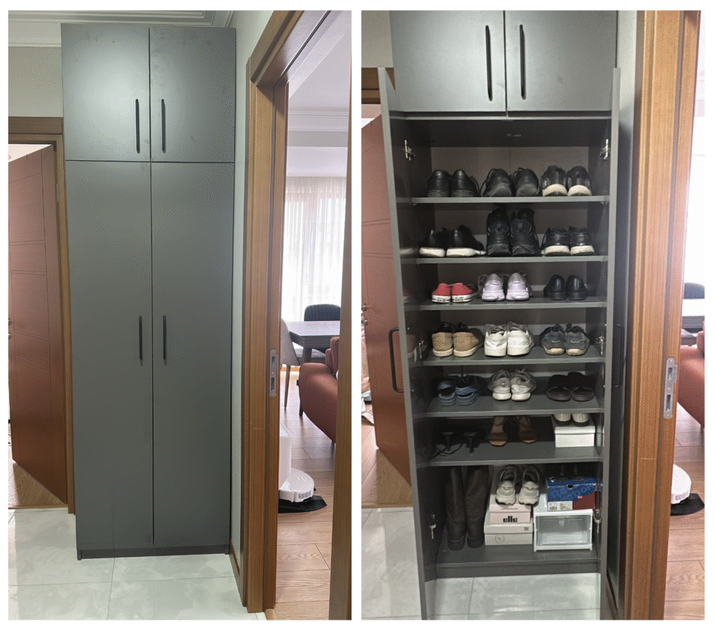 Banyo dolabını da buradan yaptırmıştım. Bu kez mutfağa bardak rafı için destek aldım. Ölçüler istediğim gibi oldu, kapağı farklı bir yerden almama rağmen uyumu sorunsuzdu. Sonuç için görsele bakabilirsiniz 🙂
